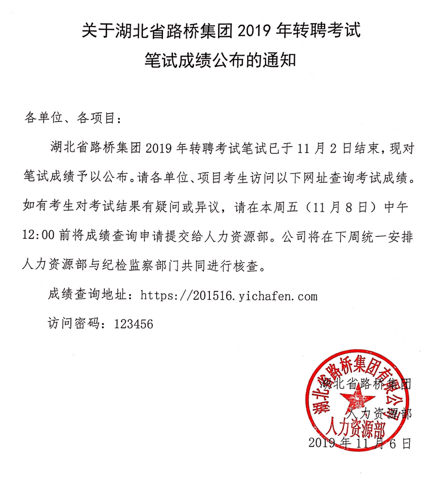 關于湖北省路橋集團2019年轉聘考試筆試成績公布的通知