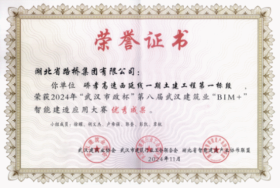 11月8日,由武漢建筑業(yè)協(xié)會、武漢市建筑工會聯(lián)合會、湖北省智能建造產(chǎn)業(yè)協(xié)作聯(lián)盟共同舉辦的2024年“武漢市政杯”第八屆武漢建筑業(yè)“BIM+”智能建造應用大賽決賽在武漢舉行,湖北路橋“硚孝高速西延線一期土建工程第一標段”BIM應用成果榮獲“優(yōu)秀成果獎”。