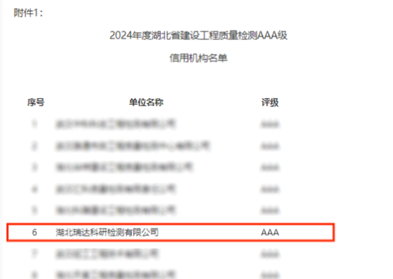 1月8日,湖北省建設工程質量安全協會發布了2024年度湖北省建設工程質量檢測AAA級信用機構評價結果,聯投湖北路橋瑞達科研檢測公司憑借優異的誠信建設和信用管理能力,榮獲最高級“AAA級”信用機構評價。